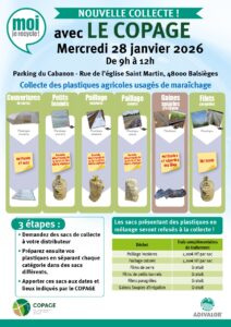 - Nouvelle collecte de plastiques agricoles usagés – MaraîchageCe début d’année est marqué par la mise en place d’une première collecte expérimentale de plastiques agricoles usagés, dédiée aux exploitations maraîchères.Cette action est proposée… Lire la suite : Nouvelle collecte de plastiques agricoles usagés – Maraîchage