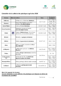 - Calendrier collecte plastique 2026Cette collecte est rendue possible grâce à ADIVALOR, l’organisme national de recyclage des plastiques agricoles, en partenariat avec COPAGE, l’association locale qui accompagne cette démarche.… Lire la suite : Calendrier collecte plastique 2026